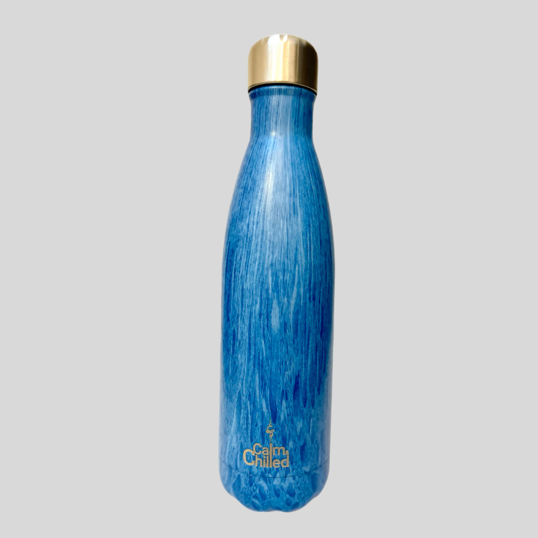 Calm & Chilled Vacuum Insulated 500ml Stainless Steel Water Bottle in Blue Wood Print 500ml. Free Personalisation