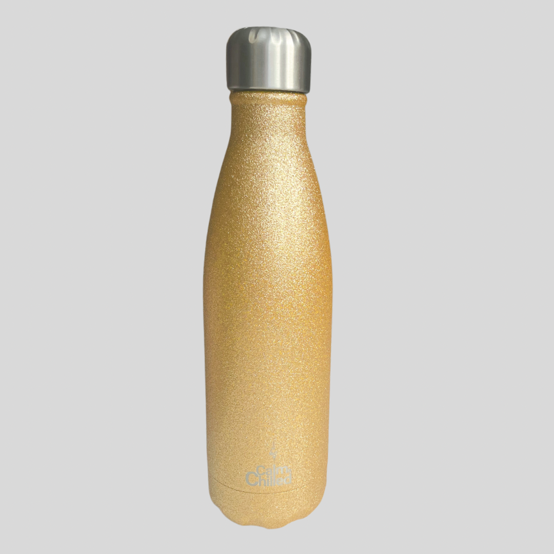 Calm & Chilled Vacuum Insulated 500ml Stainless Steel Water Bottle in Gold Glitter 500ml.