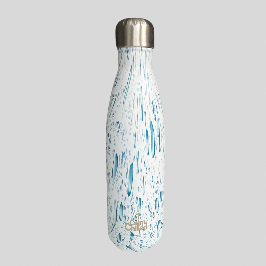 Calm & Chilled Vacuum Insulated 500ml Stainless Steel Water Bottle in Water Drops Print 500ml. Free Personalisation