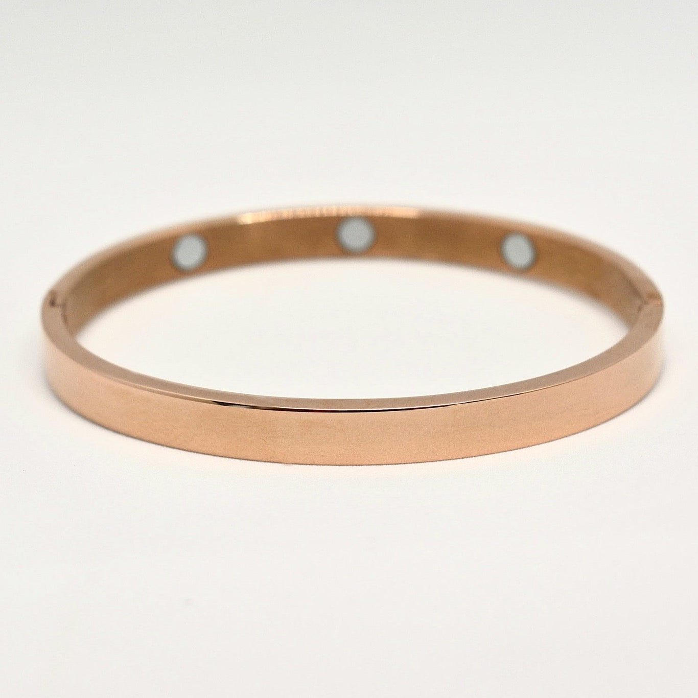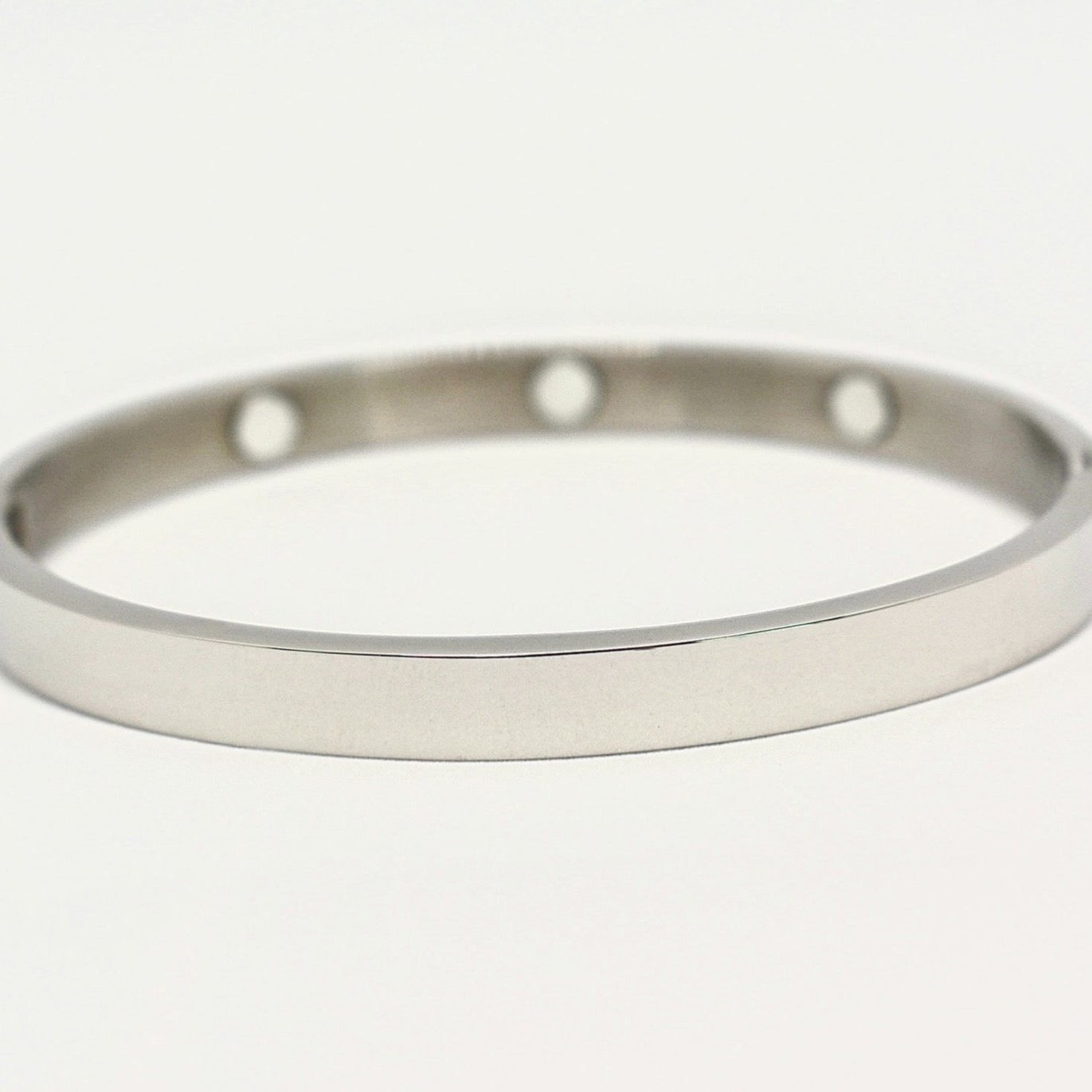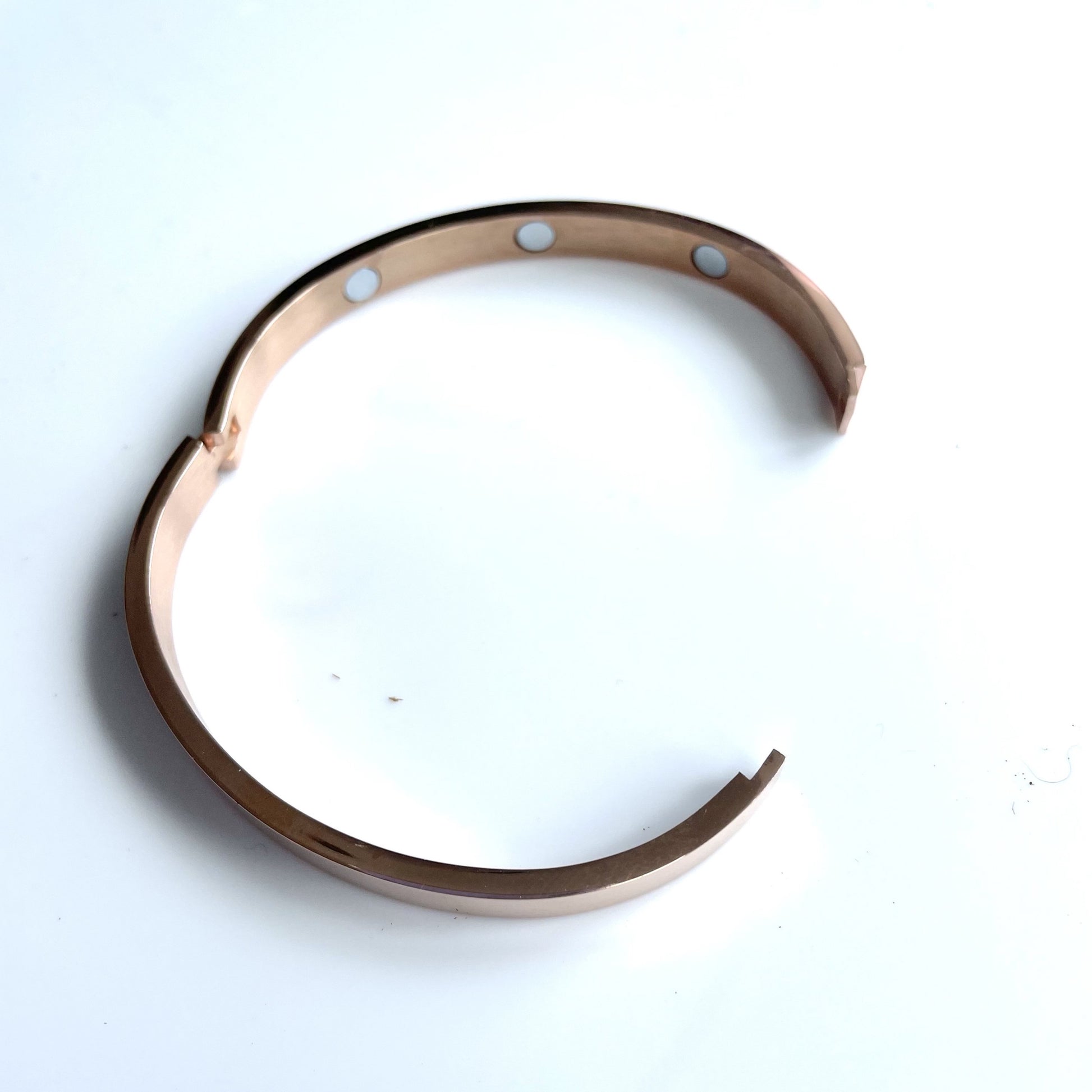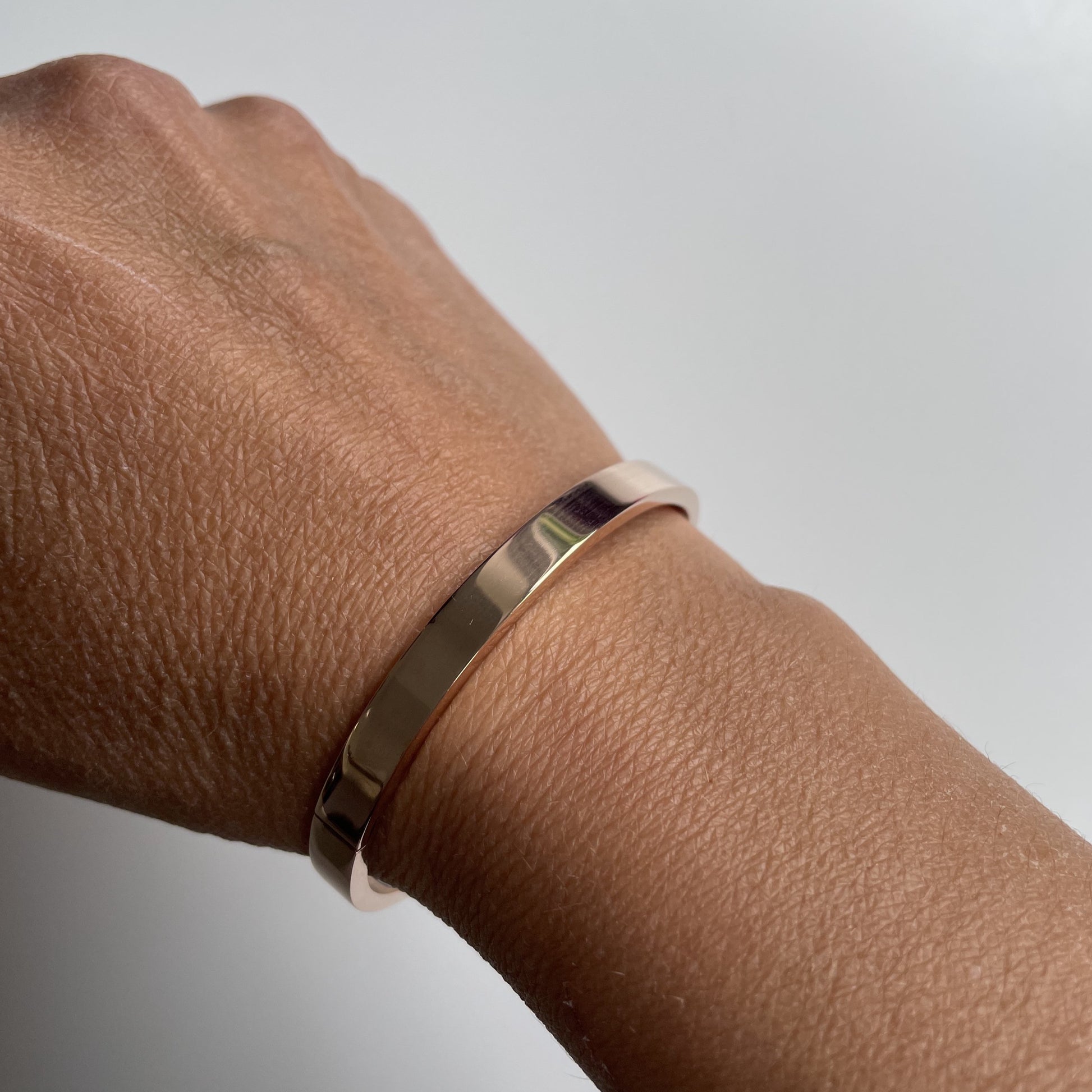 This contemporary hinged bangle measures slightly smaller for a tighter fit or for the smaller wrist. Measuring approx. 6.5cm x 5.5cm x 6mm. Available in polished Silver or rose gold.