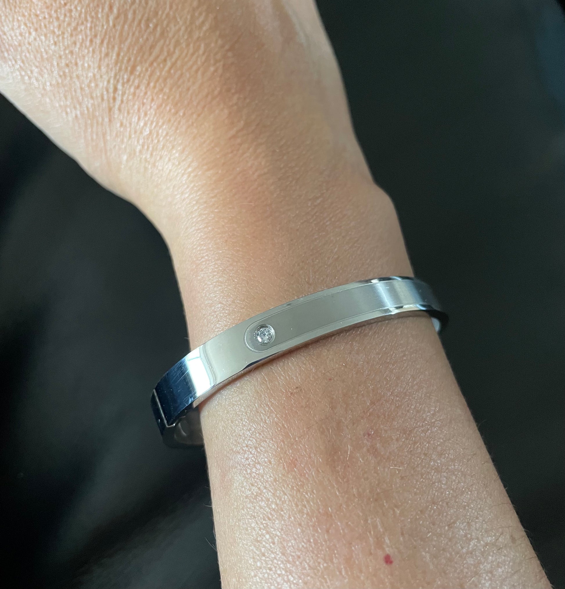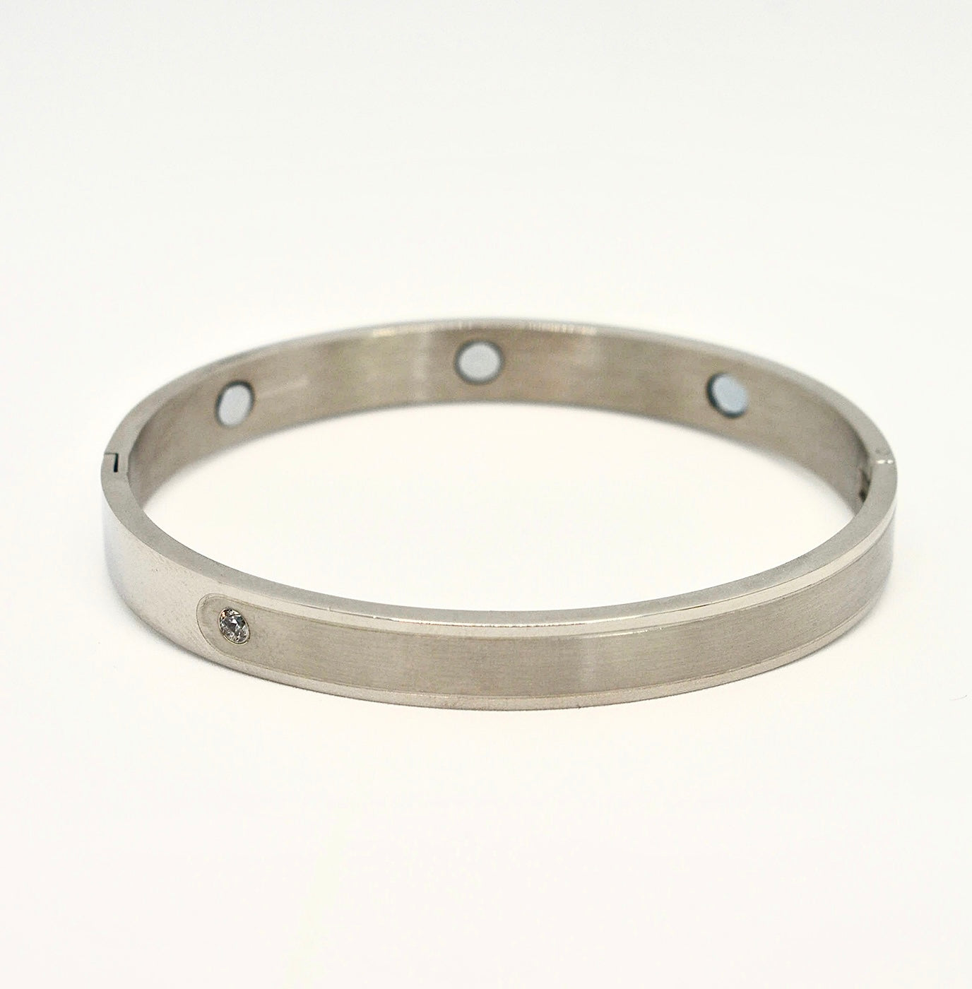 Magnetic two-tone polished and brushed silver bangle with crystal