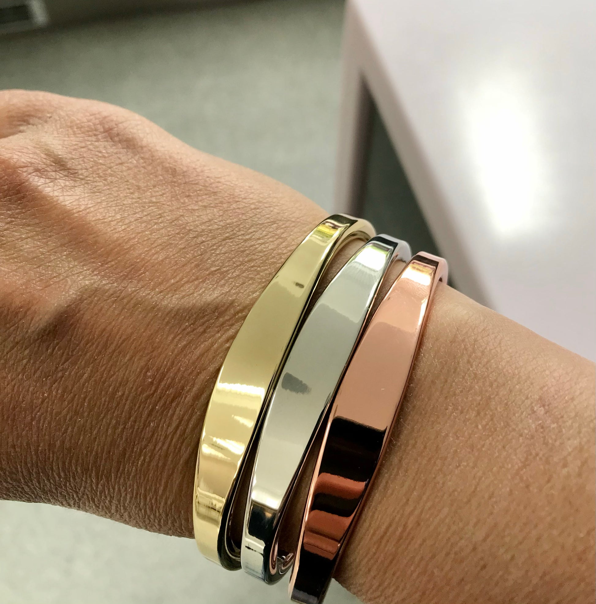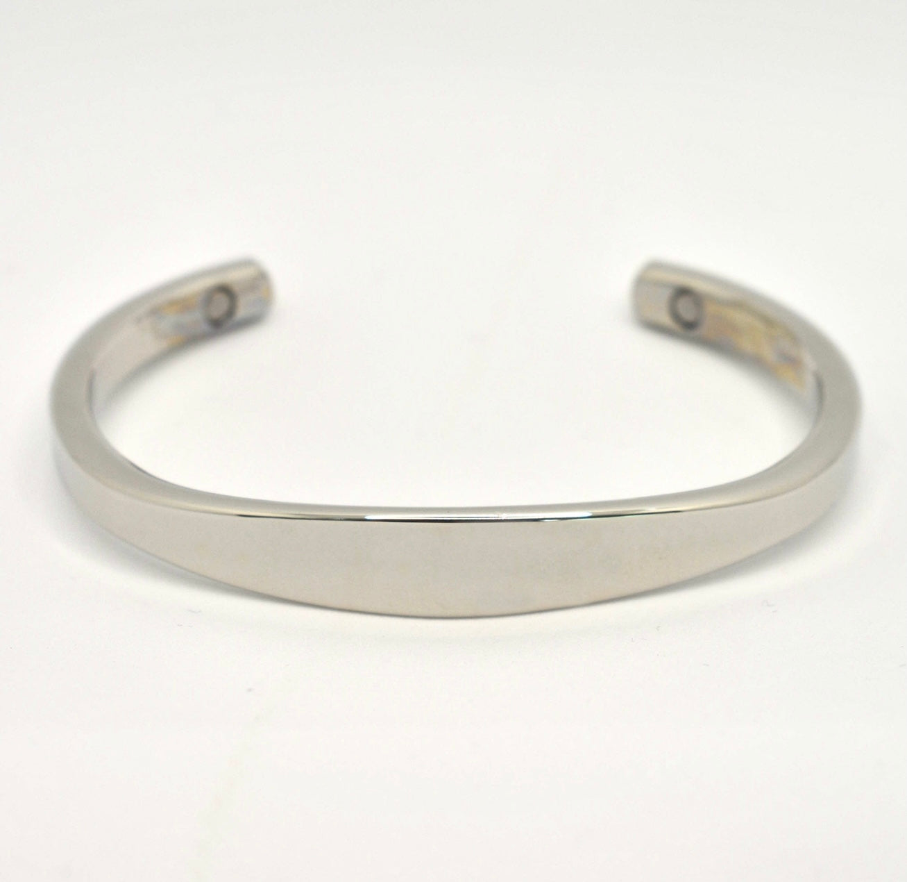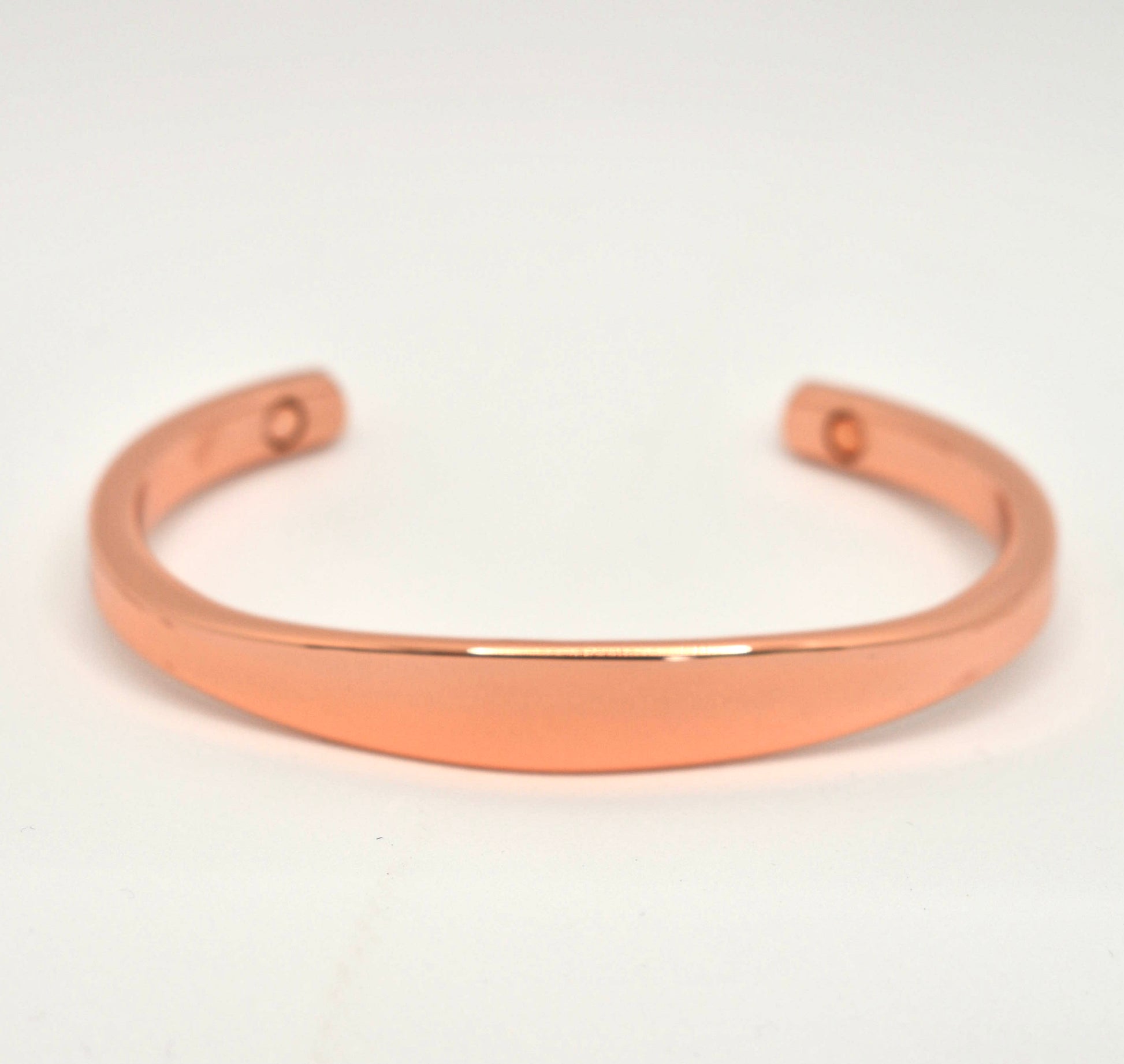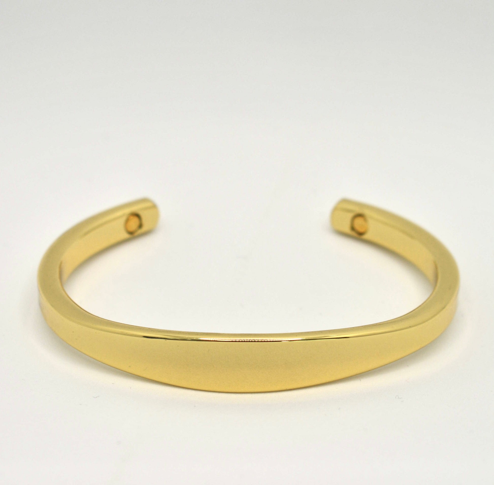 One of our best sellers. Magnetic bangle in polished finish, available in gold, silver or rose gold. Measures 1cm at widest point. Magnets contain at least 1600 gauss.