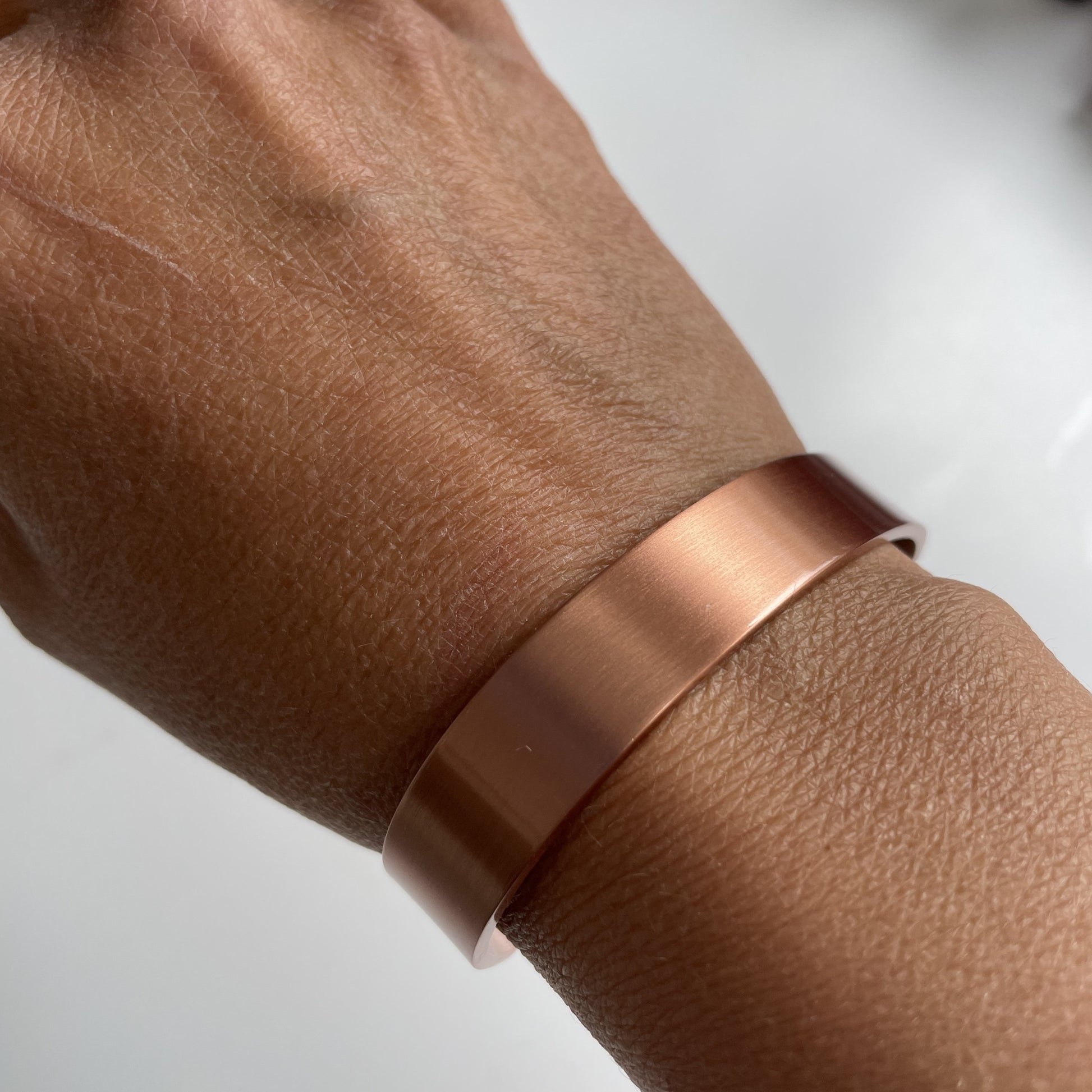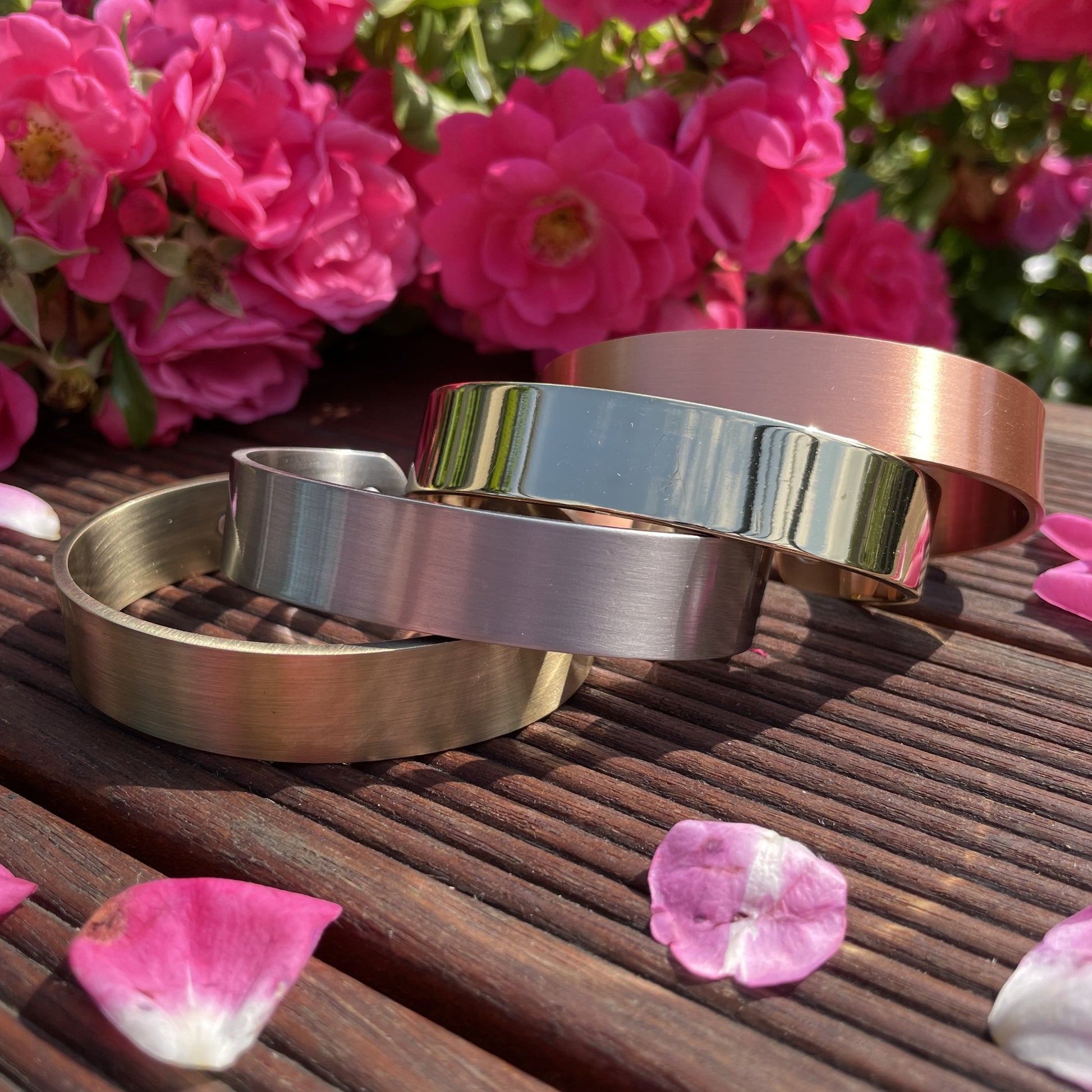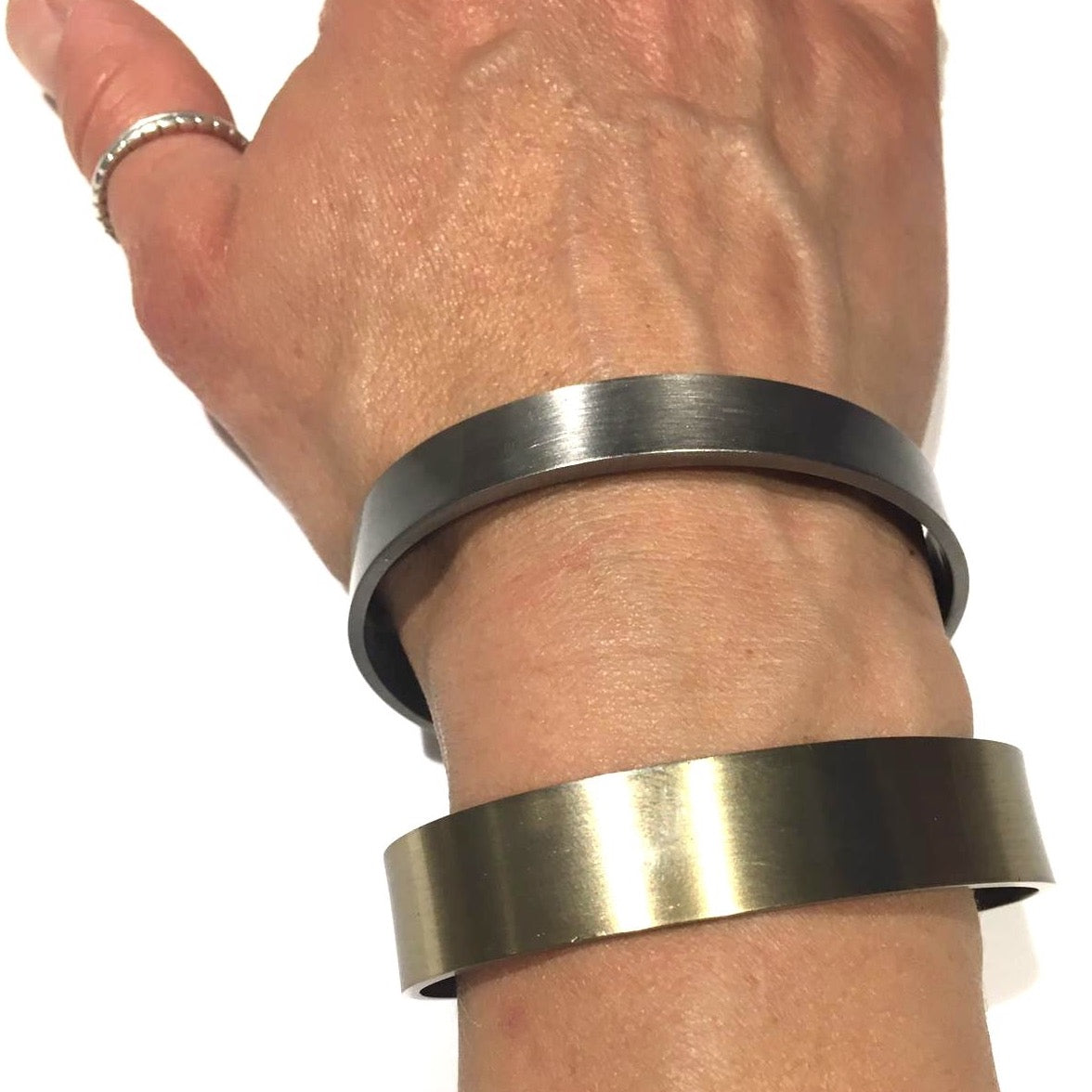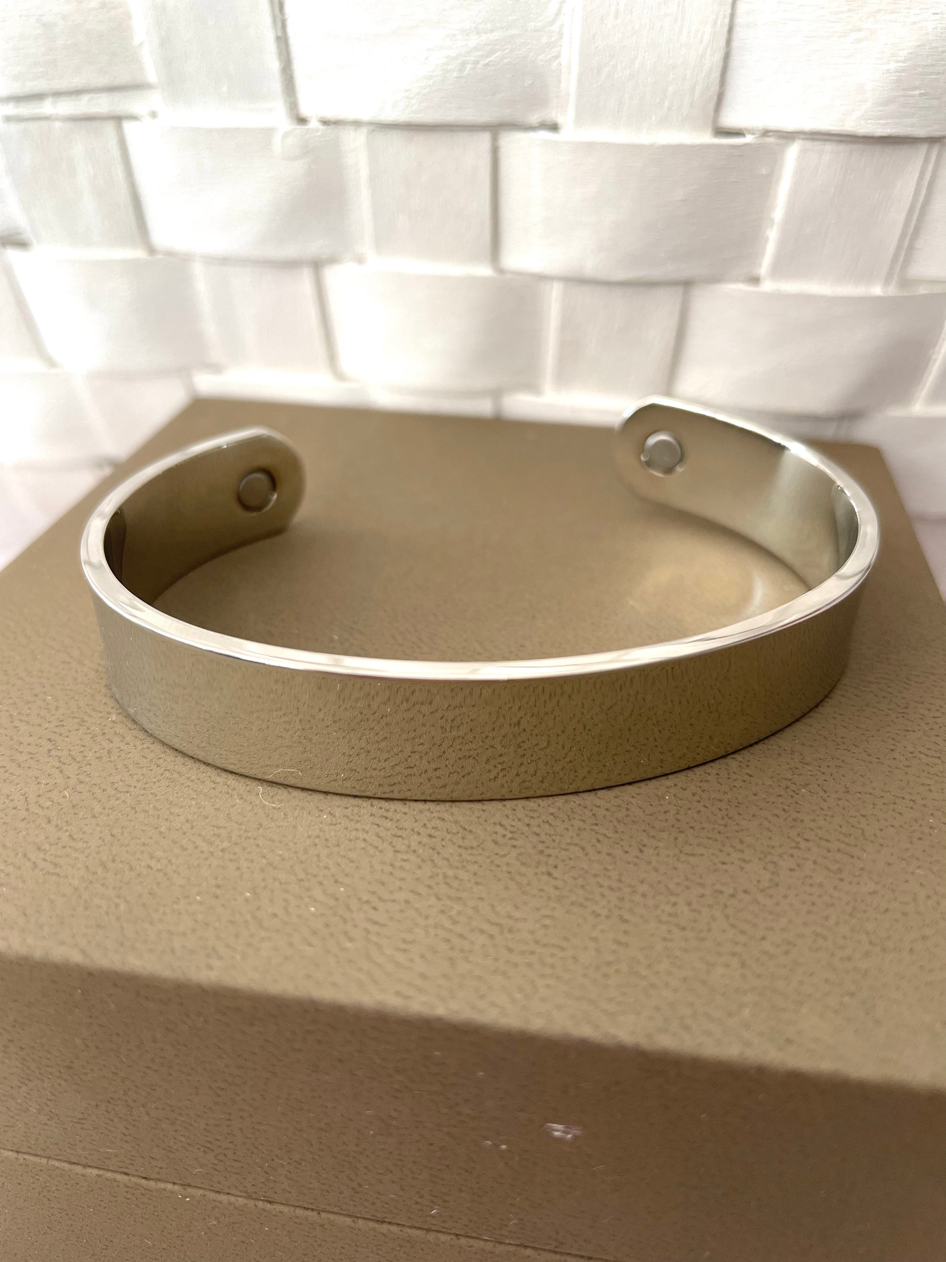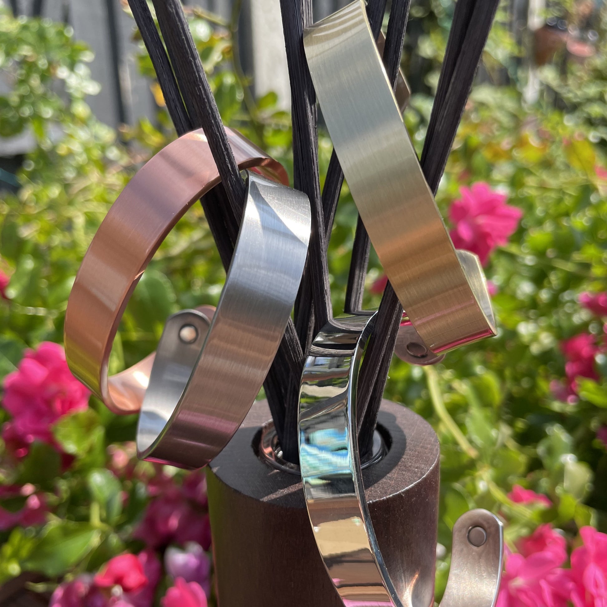 A timeless accessory – worn by men or women and in combination with each other, these plain magnetic bangles can add class and individuality to any outfit. Available in 8mm, 12mm or 15mm wide and a choice of 6 finishes – polished silver, polished gold, polished rose gold, brushed rose gold, antique brushed gold and pewter. Magnets contain a minimum of 1600 gauss each.